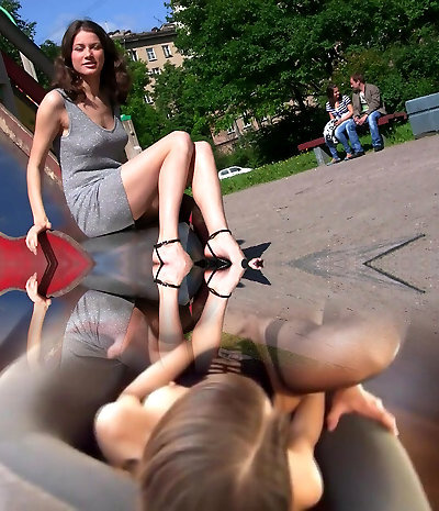 07:20Fabulous young babe in magnificent dress flashes her shaved twat in the park